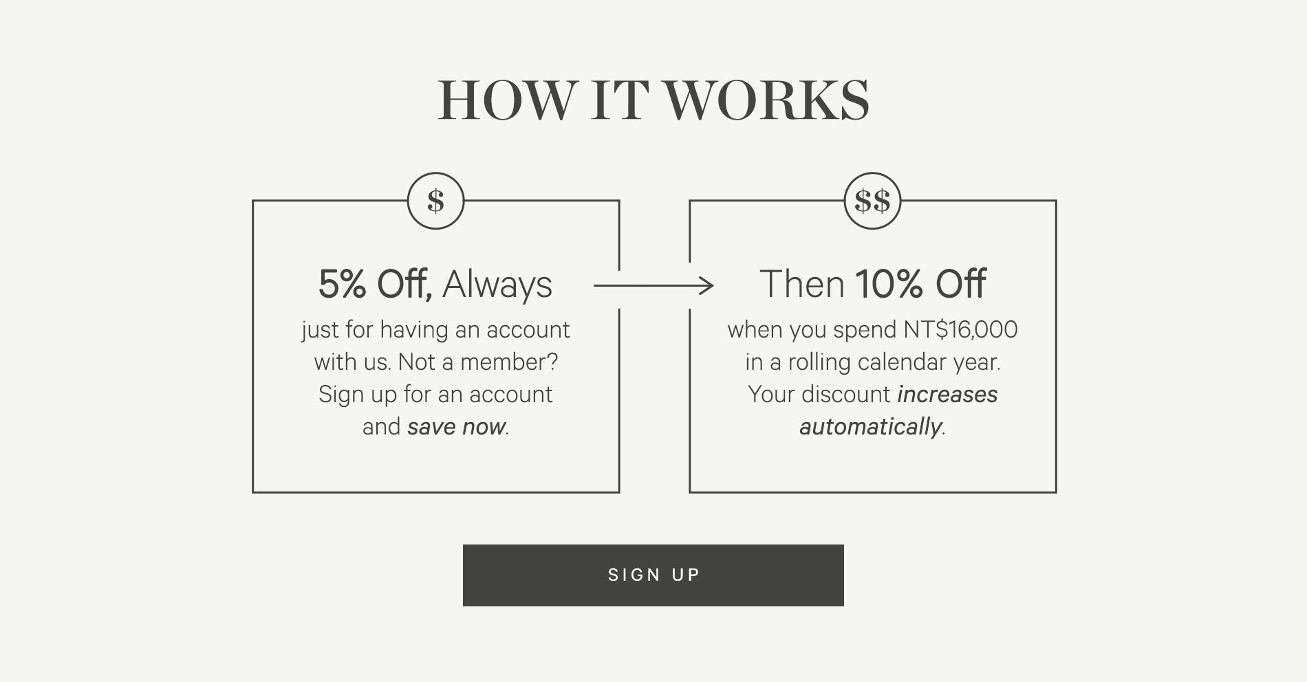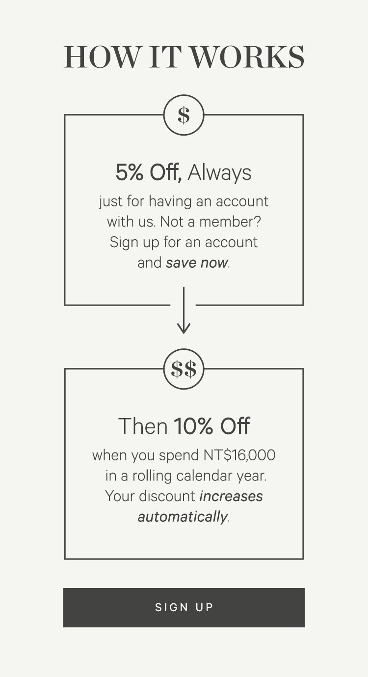 You’ll receive 5% off always when you’re logged into your account. Once you spend NT$16,000 within a rolling calendar year, your discount automatically increases to 10% off for the next calendar year. Your discount will be automatically applied at checkout, to make things easy for you.